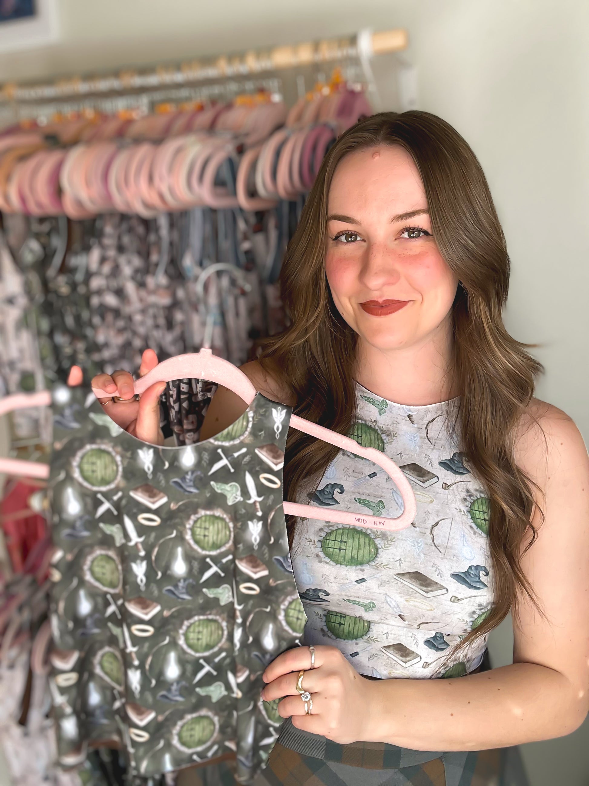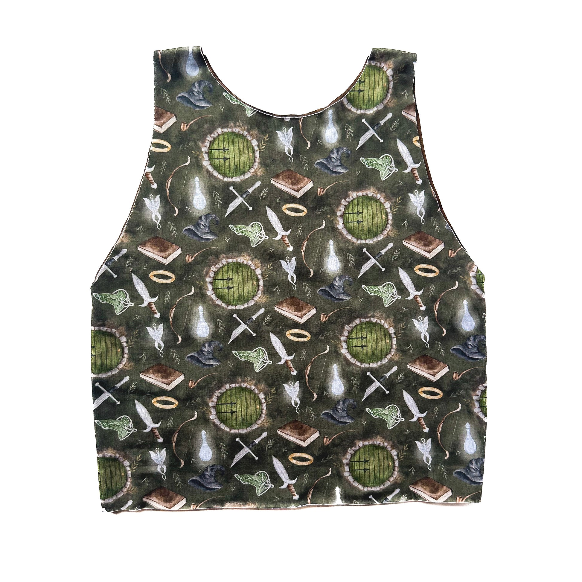 A magical bra top with a pattern inspired by a certain little guy with hairy feet and a very special ring! Fully reversible with a chocolate brown on the opposite side.