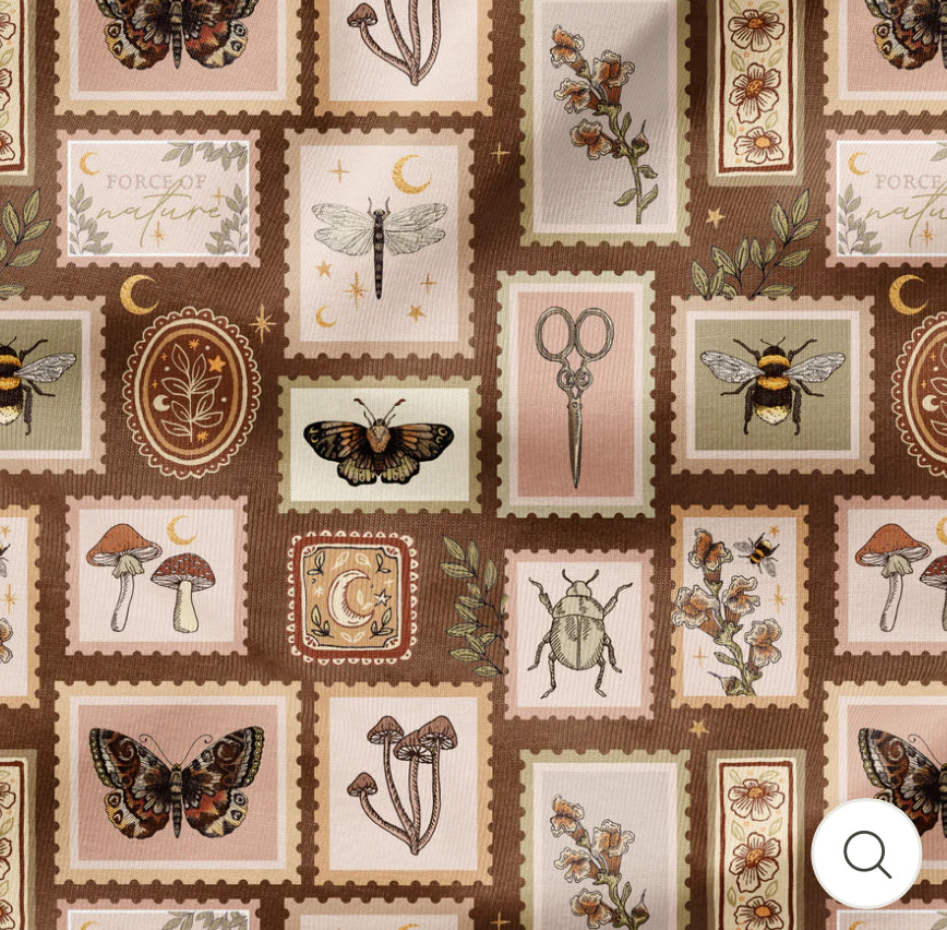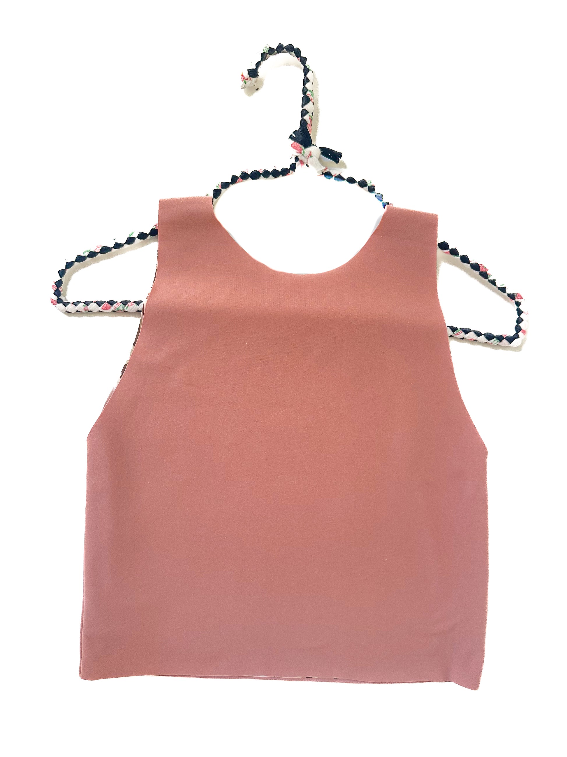 A reversible bra top with botanical stamp pattern on one side and dusty pink solid on the other side.