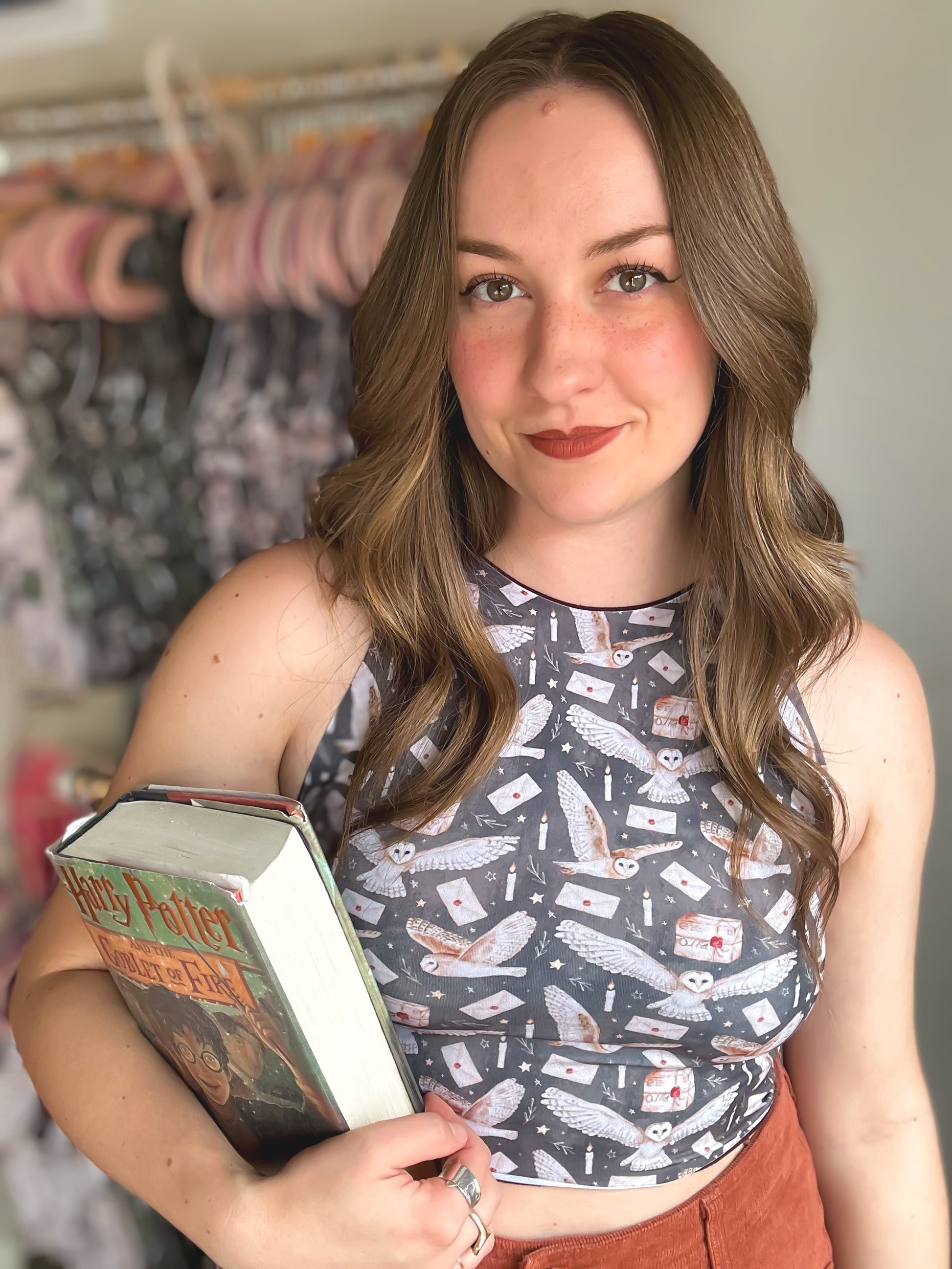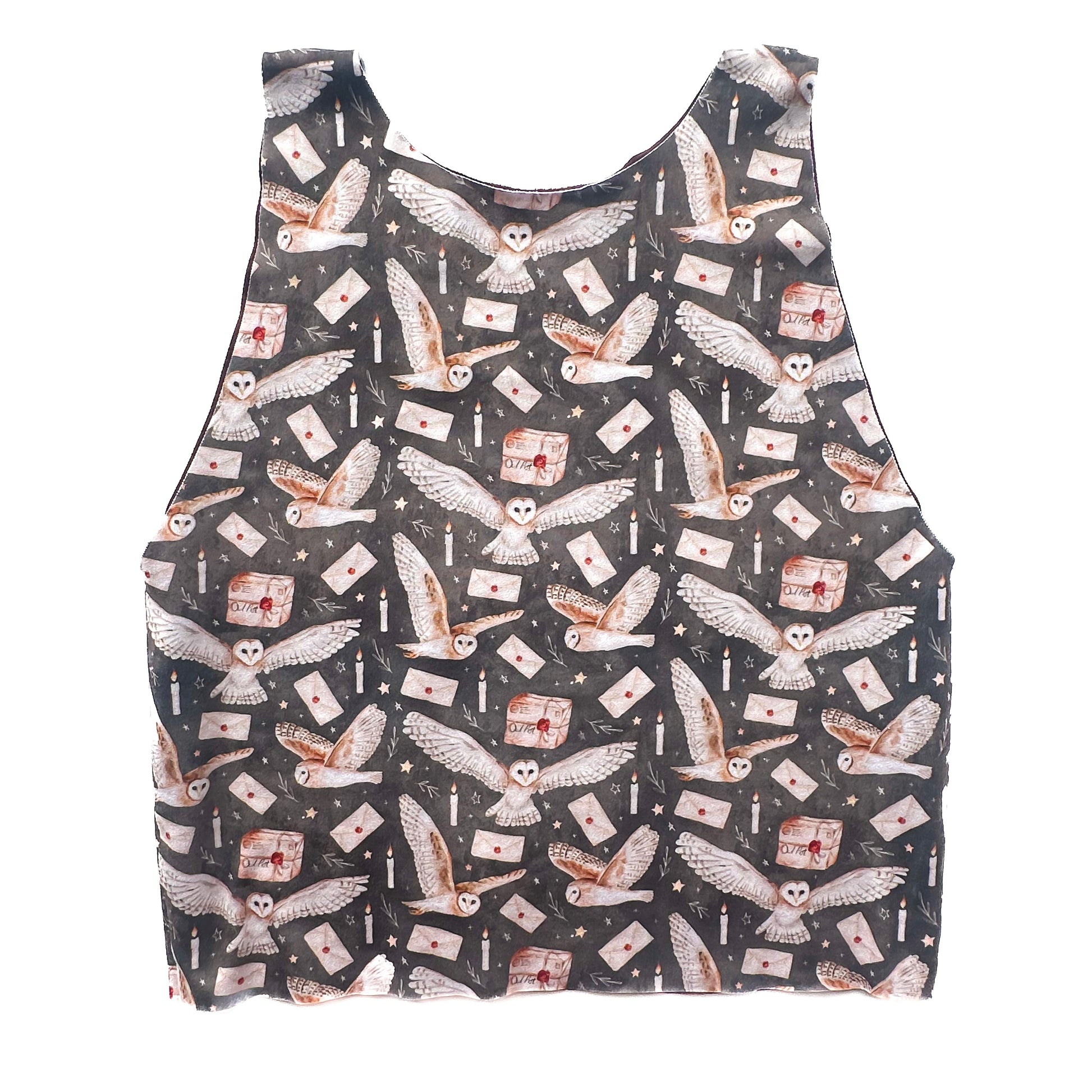 A magical bra top with a pattern inspired by a certain famous British wizard! This one features a tan background with snowy owls and mail! Fully reversible with a solid rust on the opposite side.