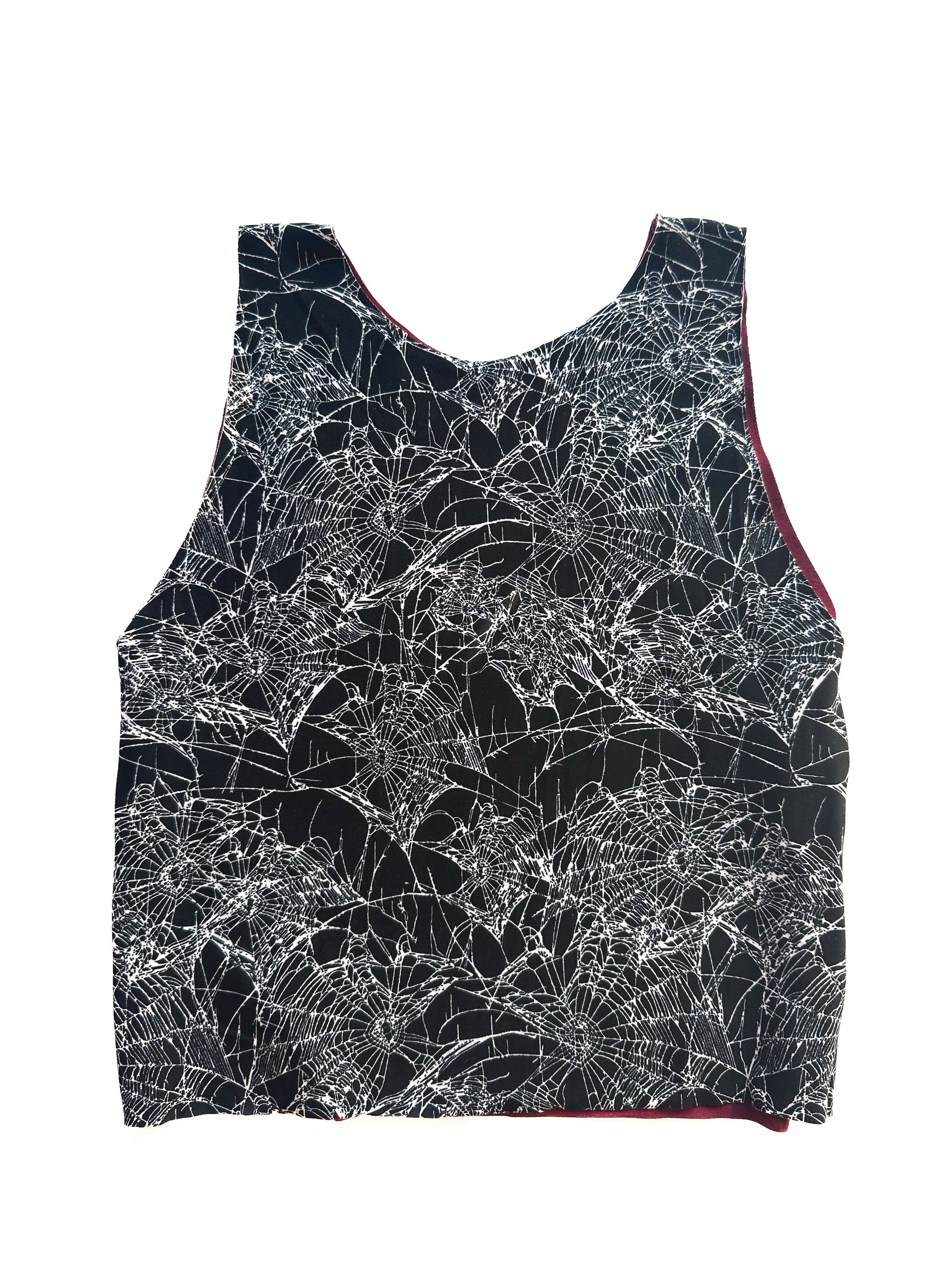 A reversible bra top with a pattern of black and white spider webs on one side and a maroon solid on the other side. Ready to ship next day!