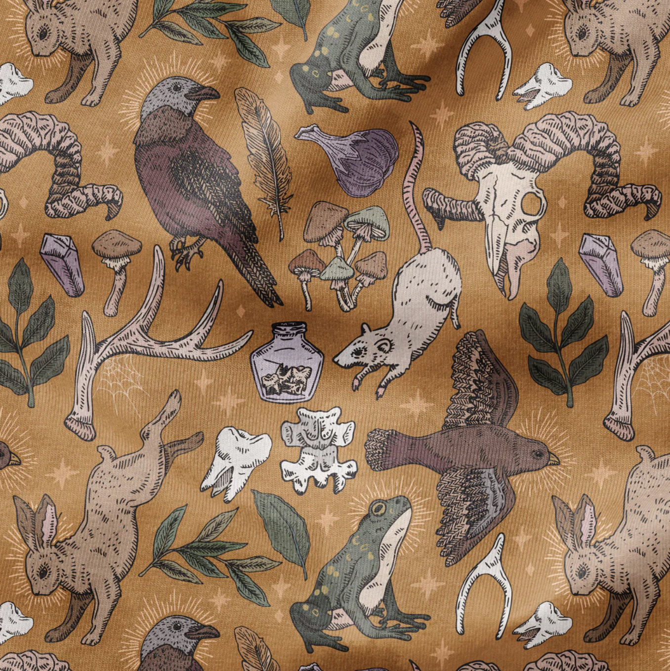 A reversible bra top with a pattern of spooky critters on one side and a purplish brown taupe solid on the other side.